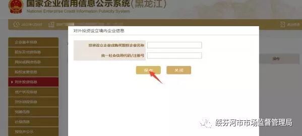 第八步:填写对外投资信息。点击左边的“对外投资信息”,之后再根据实际情况填写完点击“保存”。