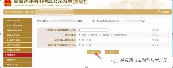 第十一步:填写党建信息。党建信息为不公示信息,主要采集企业党组织的建立情况,但属于抽查范围,请注意如实填写。其中,中共党员(包括预备党员)人数,为截至年度报告年份12月31日的人数。